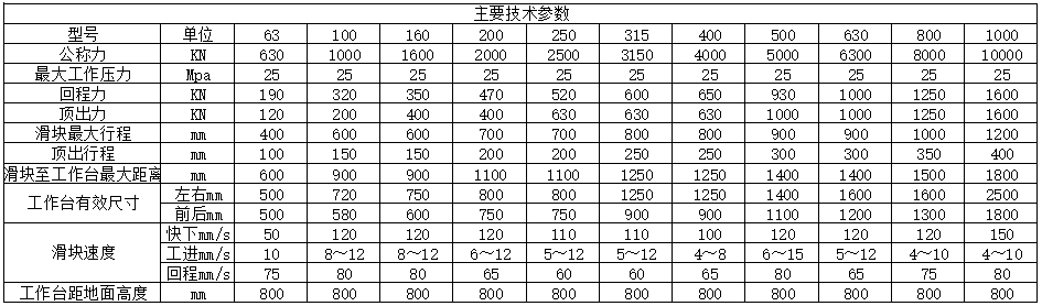 Y32系列四柱式,結(jié)構(gòu)簡(jiǎn)單、經(jīng)濟(jì)、實(shí)用;液壓控制采用插裝閥式基礎(chǔ)系統(tǒng)、動(dòng)作可靠,使用壽命長(zhǎng),液壓沖擊小,減少了連接管路與泄漏點(diǎn)。獨(dú)立的電氣控制系統(tǒng),工作直觀、維修方便。采用按鈕集中控制,具有手動(dòng)/半自動(dòng)二種操作方式 。工作壓力、行程可根據(jù)實(shí)際需要在規(guī)定范圍內(nèi)設(shè)定。